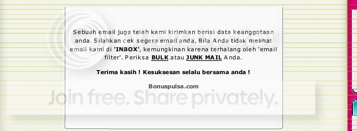 Anda akan menerima SMS Pemberitahuan bahwa aktivasi pendaftaran di Bonus Pulsa telah berhasil. Selamat, kini Anda sudah bisa melakukan isi ulang sendiri dan mendapatkan hak bisnis Bonus Pulsa.